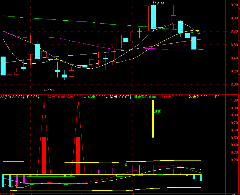 低位金叉:CROSS(A,B) AND A<-0.1,COLORRED;